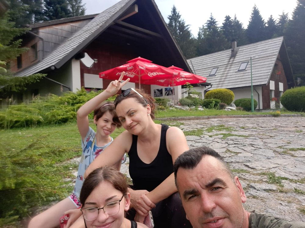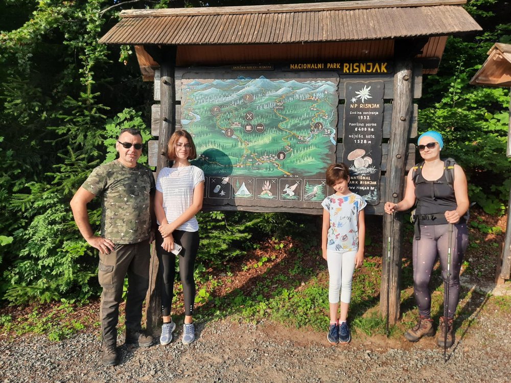 Nakon toga upućujemo se u mjesto Crni lug u istoimeno prenoćište NP Risnjak gdje spavamo. Smještaj vrhunski, osoblje ljubazno. Ujutro se budimo puni elana u 6:30 s namjerom da osvojimo vrh Risnjaka. Maglovito jutro malo nas plaši, ali za naše domaćine to je sve normalno, kažu: nekad ti prođu sva 4 godišnja doba u danu. Doručkujemo i krećemo ispred prenoćišta NP-a tzv. Horvatovom stazom prema vrhu. Uz mene i Adelu u osvajanje vrha idu kćerke Zara(13) i Dita(10). U razgovoru s domaćinom treba nam oko 3 sata, možda i malo više, zavisno od odmora. Slikamo se za uspomenu na samom polazištu pokraj pokazne ploče. Magla nestaje, a mi krećemo nasutim širokim putem. Nakon sat vremena hoda, prateći planinarske oznake, nailazimo na prvu tablu koja nam pokazuje smjer i da imamo još 2h do vrha. Tu se odvajamo od širokog šumskog puta i krećemo uskom ali uređenom planinarskom stazom u koloni. Trenutno smo na 920m. Uskoro stižemo do table Vučja jama. Nalazimo dijelove debala koje su radnici parka osmislili kao stolice za odmor. Čitamo tekst sa ploče i gledamo ograđenu jamu. Dubina 140 m, impresivno! Tek 1991.g. je detaljno istražena. Nastavljamo ne baš zahtjevnim stazama te se prisjećam kako sam kao student prije 20 i nešto godina prošao istim putem i slušao profesora o šumama i šumskim zajednicama koje se smjenjuju prema vrhu, po čemu je Risnjak i poznat. Govorim svojim curama o vrstama drveća, životinjama, šumi, o tome kako je ovdje čovjeku puno toga zabranjeno činiti jer ovdje se šuma sama rađa, sama živi i sama umire. Ona je iskonska, kao da čovjek ne postoji. Čovjek smije djelovati samo one nužne radove, npr. prerezati drvo koje je palo preko planinarske staze. Pričajući tako prolazimo mješovitu šumu bukve i jele, pa dijelove čiste bukove šume pa srećemo i smreku koja je nažalost dosta stradala od potkornjaka te je mnogo suhih stabala. Pravimo male pauze za okrjepu i sve više srećemo stijene u šumi. Staze su i nadalje uske, na mjestima treba biti i oprezan jer negdje su odroni, dolutali komadi stijene, otpale grane, no uglavnom prohodne. Uskoro stižemo do iduće table, ovdje planinarska staza siječe šumski put, a zove se Moravčeva staza. Piše: 45 min do vrha, pa smo vidno i sretniji. Trenutno smo na 1200m. Nastavljamo planinarskim putem koji postaje pomalo strmiji, kamena je sve više i ulazimo u pretplaninsku šumu bukve koja je zbog visokih snijegova povijena u blagom obliku slova "J". Priroda pokazuje svoje ljepote te je na jednom mjestu gdje odmaramo "isklesala" kamene fotelje. Približavamo se vrhu, vegetacija je sve niža a drveće rjeđe i kao zakržljalo. Pojavljuju se i prvi otvoreni prostori. Pomalo se osjeća i umor a mlađa kćer kaže da joj je ljudska baterija skoro na 0%. Nailazimo i na prve vrhove stijena bez drveća, samo prizemno rašće i cvijeće u cvatu s puno živih kukaca. Prvi put vide se okolne planine. Uske staze vrludaju između stijenja i pokojeg grbavog stabla i konačno ugledasmo krov Schlosserovog doma. Konačno odmor i za roditelje zasluženo pivo! Visina 1418m. Dom ne radi, ulazna vrata zavarena!!! Kad upitasmo zašto, odgovor je bio zbog migranata! Devastiran je iznutra, štete preko 100.000 kn. Obzirom na teže ljudske napore, u šoku smo šta će migranti ovdje na vrhu!? Ostaje je nam još vrh, tako blizu a tako daleko. Usput, ima jedan sivi oblak no ustrajni smo da osvojimo vrh. Mlađa kćer odustaje zbog "ljudske baterije" i ostaje kod doma. Krećemo prema vrhu susrećući pokoju grupicu planinara. E sad već radna temperatura raste. Nosim još i ruksak, a za uspon na mjestima treba i 4x4. Na mjestima je postavljena sajla za lakši uspon. Došli smo pred sam vrh i počinje grmljavina, poneka munja. Umorni smo jako no inzistiram da dotaknem opet taj "upravljač". Kažu, sreća prati hrabre i poput divokoza u skokovima stižemo do vrha. Slikica za uspomenu, vrijeme postaje sve gore, upisujem se opet u knjigu i doslovno bježimo dolje. Usput, Adela nezgodno staje na stijenu, malo iskreće zglob, ali dobro je prošlo. 50 m od doma kreću krupne kapi i stajemo uz vrata doma. Slijedi pravi pljusak te čekamo. Ne prestaje padati te kad je kiša malo ublažila, krećemo nazad istim putem. Imali smo par padova zbog kliskog kamenja ali bez posljedica. Nešto kraće vremena nam je trebalo do polazne točke, no morali smo lakše zbog vlažnog terena. Stižemo u restoran i osvježavamo se crnim hladnim radlerom(preporučamo ga) i Cedevitom. Pokraj restorana nalazi se suvenirnica gdje curama kupujemo majice s temom Risnjaka, mami magnet, a tati lončić! Još jedno lijepo iskustvo! Nakon odmora krenuli smo put mora, a u nedjelju slijedi novo područje, novo osvajanje i nova priča!
