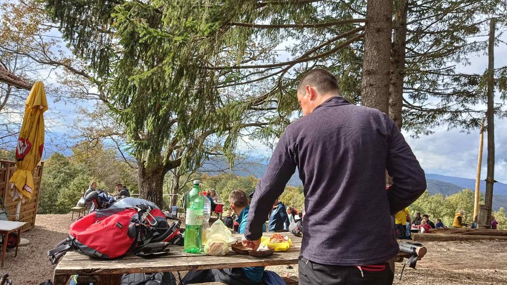 Konačno smo došli do drugog planinarskog doma. Bila je ogromna gužva. Neki su čekali čak 46 minuta da dobiju jelo. Drugi su jeli sendviče ili čika Mislavov kulen, slaninu i sir. On uvijek ponese za cijeli razred. Odrasli su morali nadoknaditi i elektrolite. Elektroliti su nešto jako važno.