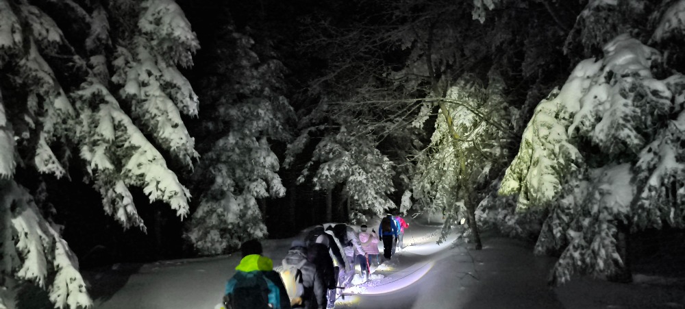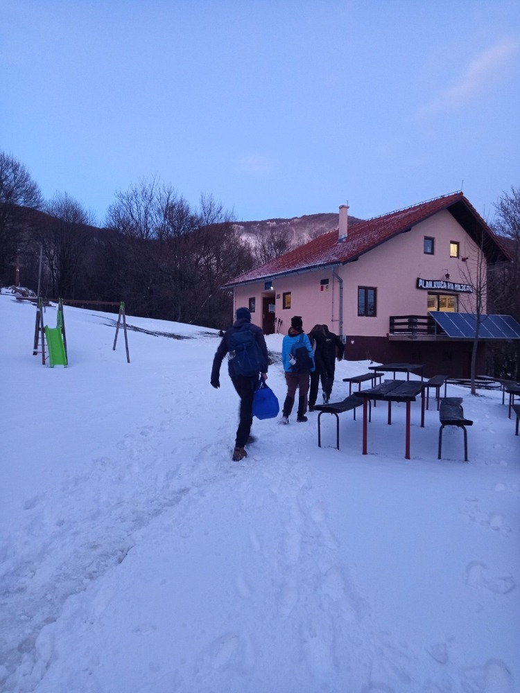 Uspon je započeo oko 19:00 sati, pod svjetlima čeonih lampi koje su parale tamu i osvjetljavale snježnu stazu pred nama. Noć je bila tiha, a snijeg je prekrivao šumu i planinarske putove debelim, mekanim slojem. Svaki korak propadao je u bijeli pokrivač, što je uspon činilo fizički zahtjevnijim nego inače. Iako smo svi bili spremni na zimske uvjete, količina snijega dodatno je otežala hodanje i tražila više snage i koncentracije.